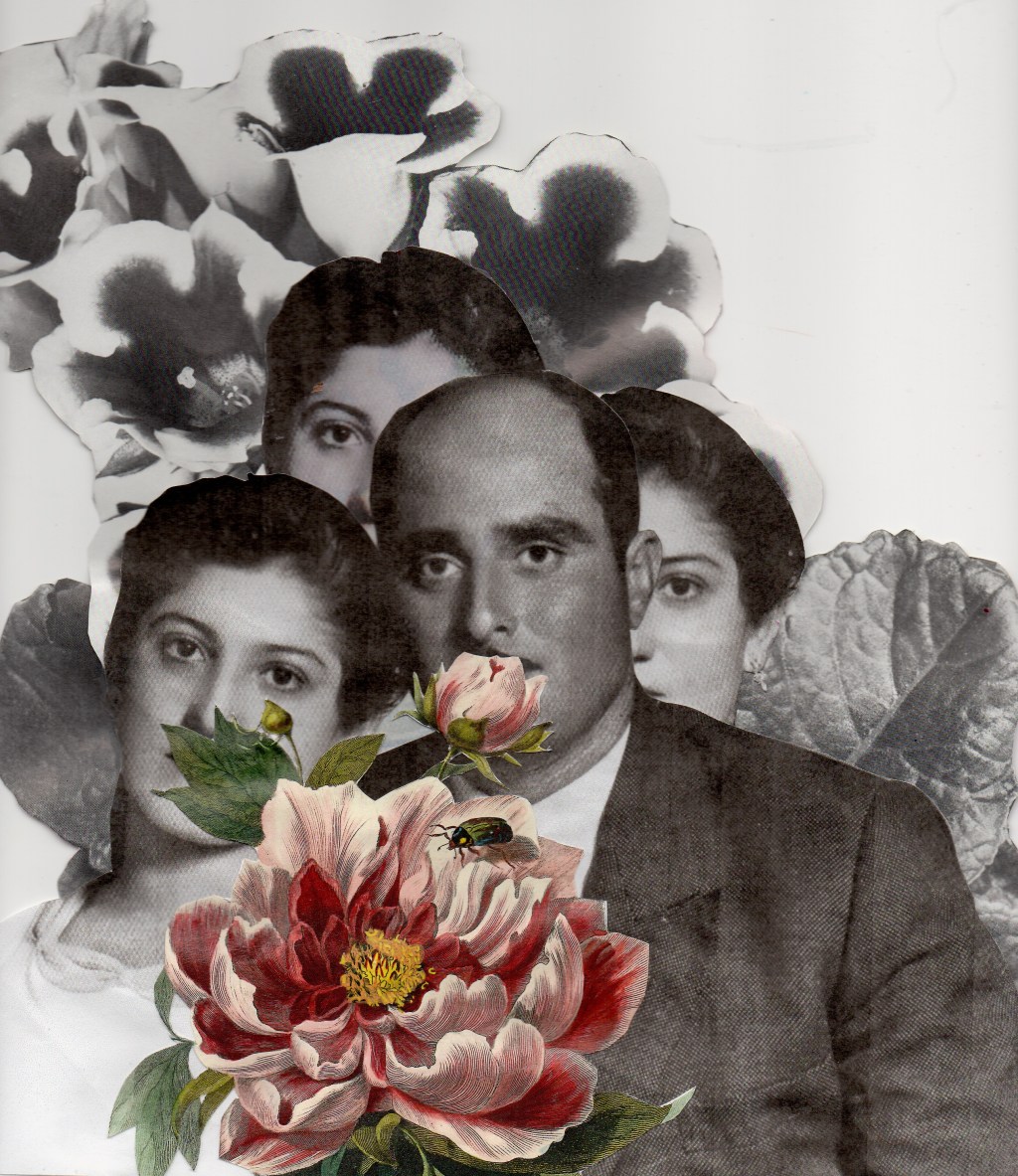 Image Description: collage of black and white photo of artist’s grandparents with flowers and leaves behind them. In the back the artist’s tayta (grandmother) is repeated three times to make a triangle shape. In the foreground is a pink flower with leaves and a beetle on the petals. The leaf is cover the woman’s mouth and a flower bud is covering the man’s mouth.