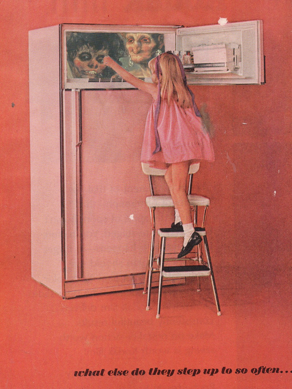 Image Description: Collage on red toned photo with girl climbing up stool to open the refrigerator to monster like women. In the right corner is the phrase “what else do they step up to so often…”