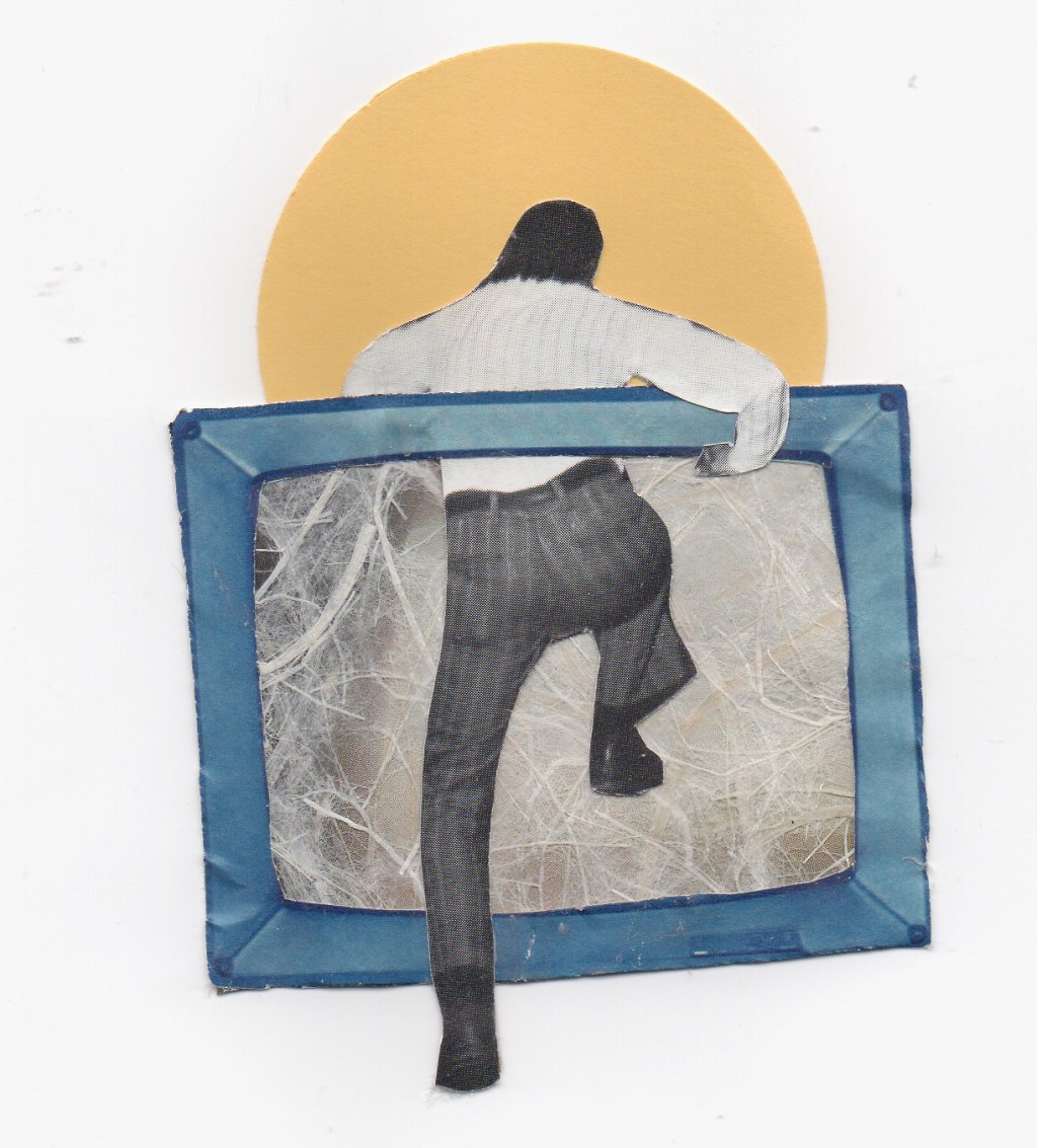 Image Description: collage of man climbing (his back is to the viewer) through blue televsion, fuzzy screen, and and when he crawls out there is a yellow halo.