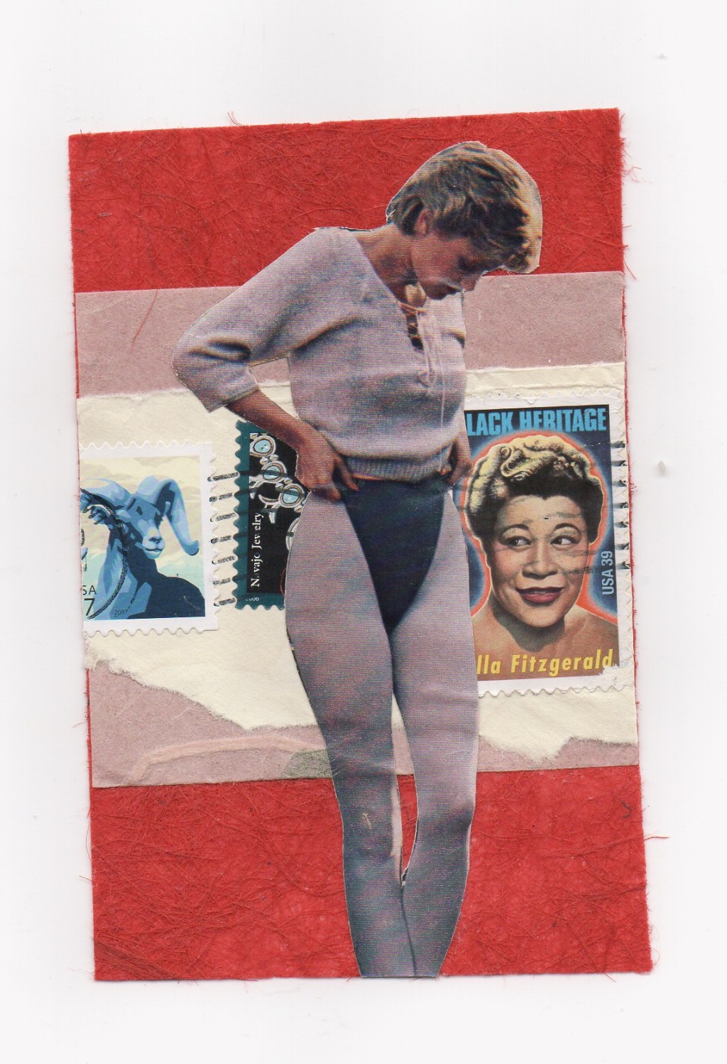 Image Description: Collage of woman wearing workout clothes, looking down and pulling up her tights. The background is red and in the center is white with three stamps (ram, jewelry, and Ella Fitzgerald).