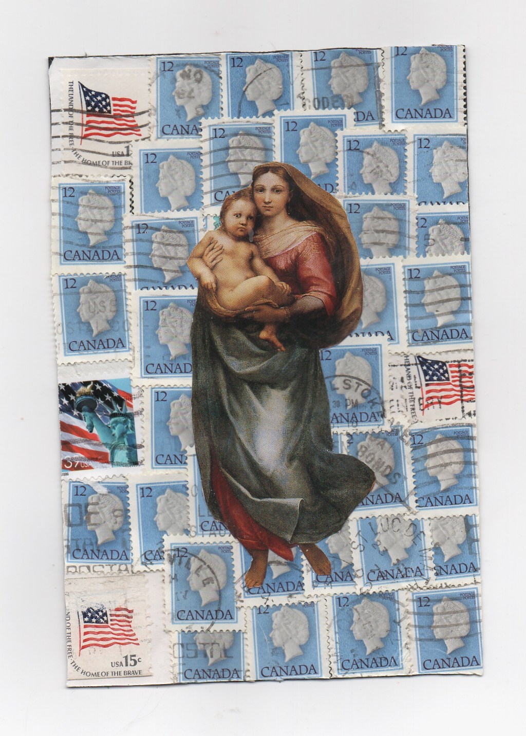Image Description: collage of individually laid blue Canada stamps, random American flag stamps dispersed. Center is Mother and Child standing and looking at viewer.