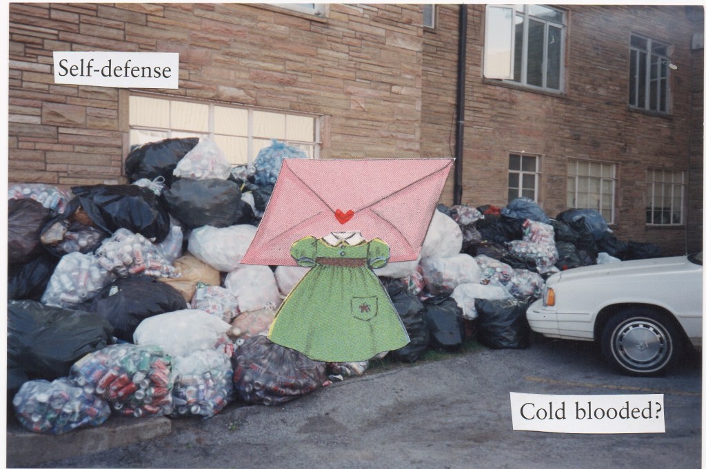 Image Description: collage of floating green, child’s dress with pink love letter behind outfit. The background is backs of piled up garbage. It says, “Self defense, cold blooded?”