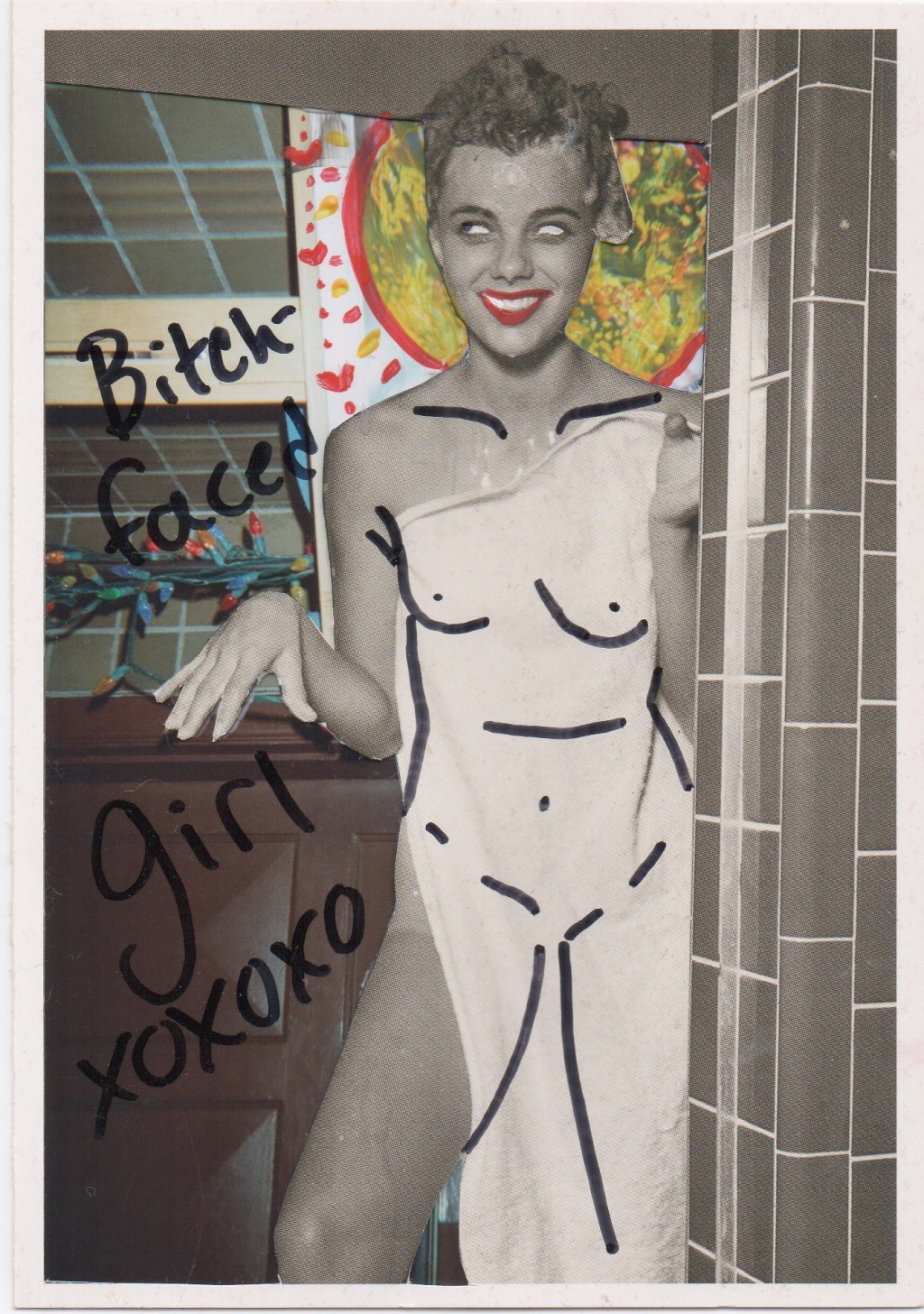 Image Description: collage of woman with white out eyes, wearing only towel, has wet hair, and standing by tile wall. She has a yellow and red halo, hearts and dots surrounding it. It reads “bitch-faced girl XOXOXO”