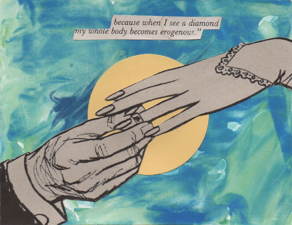 Image Description: collage with marbles blue and green background, hands meeting to put on wedding ring. Where hands meet is a yellow halo. It reads, “because when I see a diamond my whole body becomes erogenous,” above hands.