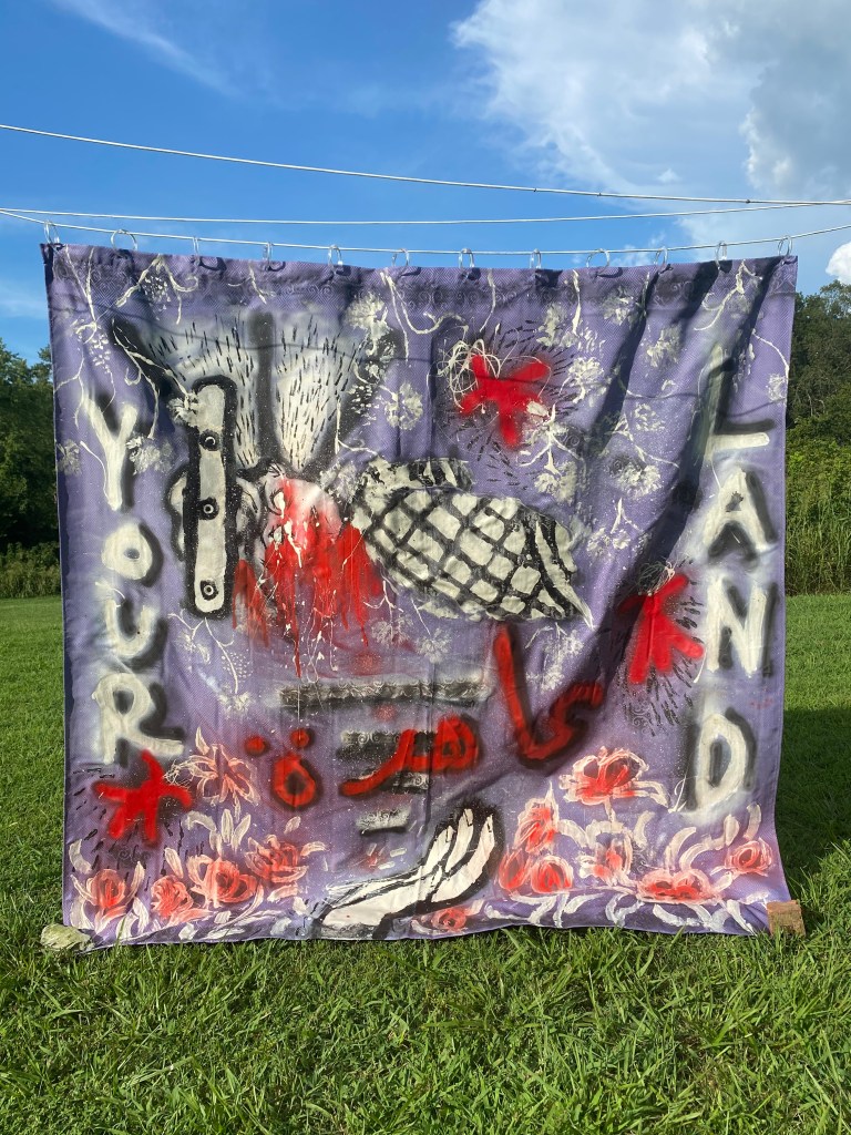 Image Description: Lilac shower curtain with floating head in the center and halo of eyes. The head is on its side and leaking blood with a kafeyyi bursting from the neck; the blood drips onto yasmines and into an open hand. There are wasps and pressed grape leaves throughout the painting. On the sides it reads “Your Land” and in the center reads “عاهرة”.