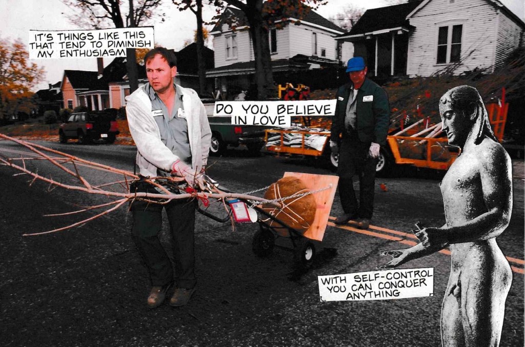 Image Description: Photo of man pulling tree to be planted in residential neighborhood, archaic greek statue in the foreground, text across image reads as two people talking, “It’s things like that that tend to diminish my enthusiasm. Do you believe in love? With self control you can conquer anything.”