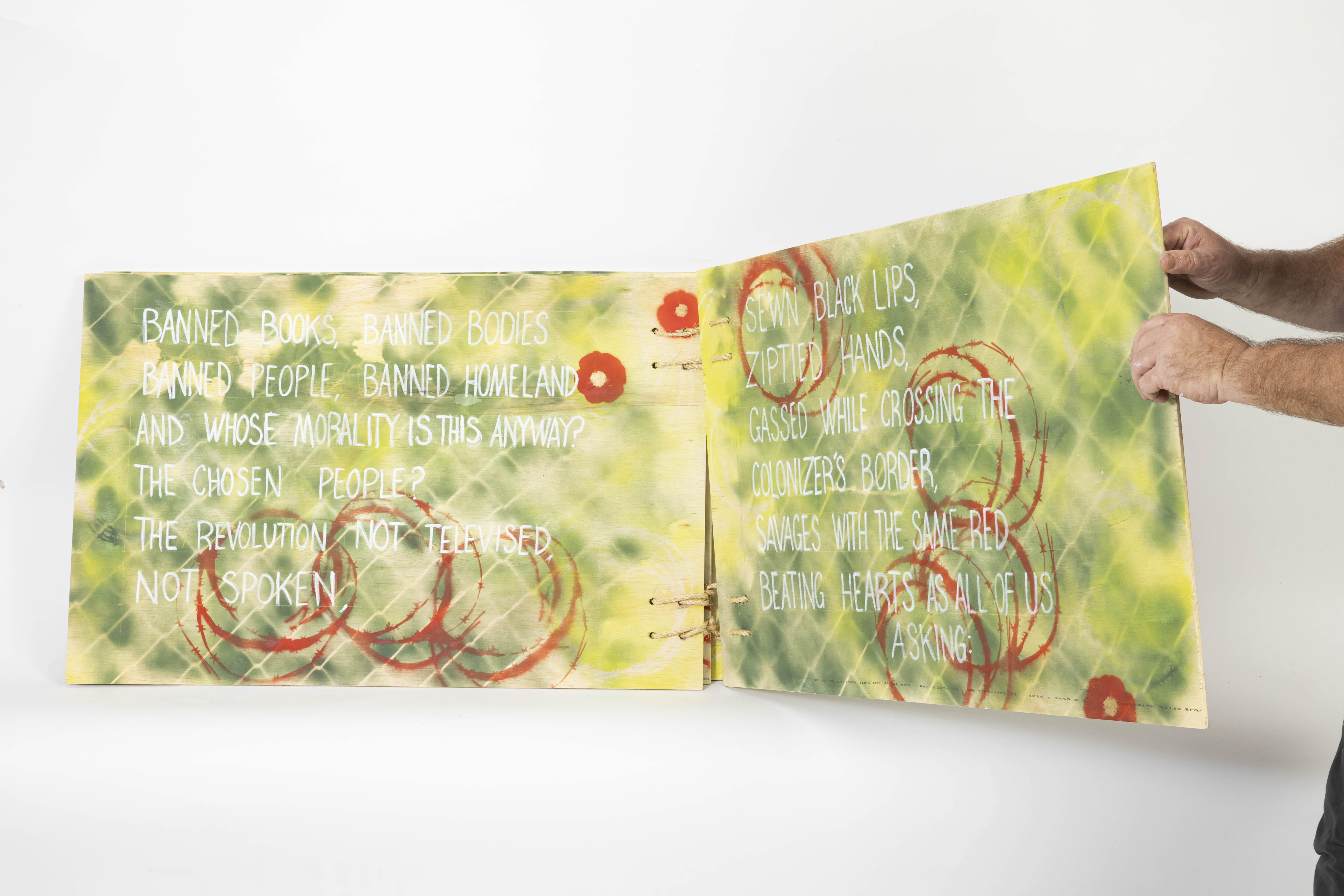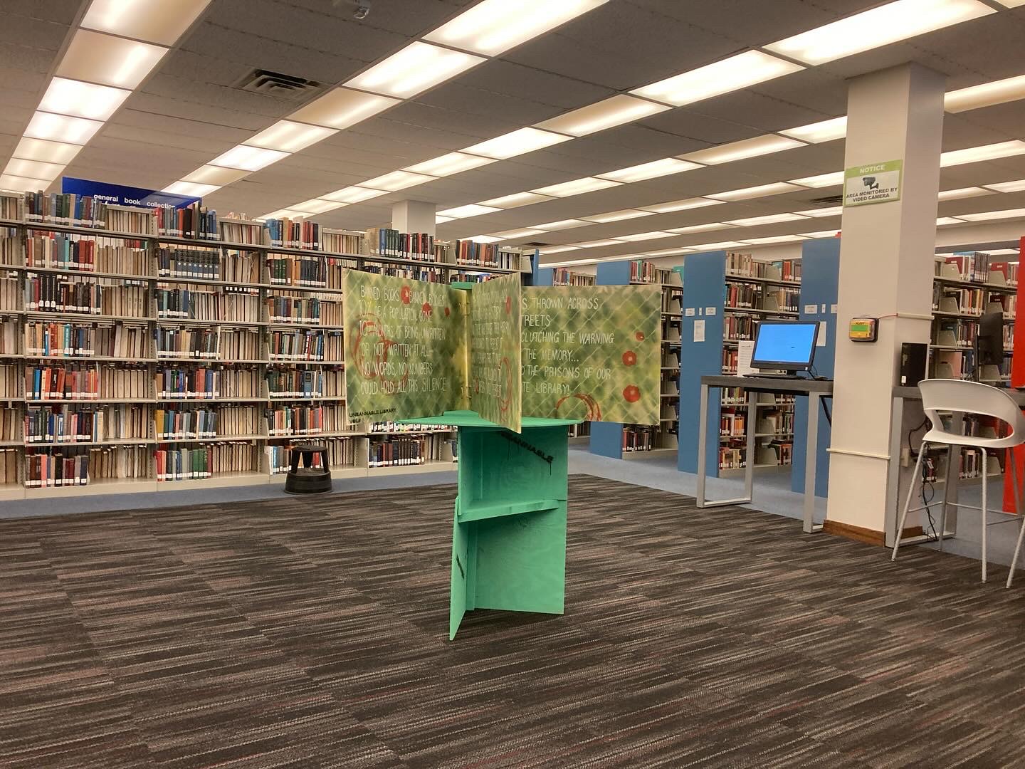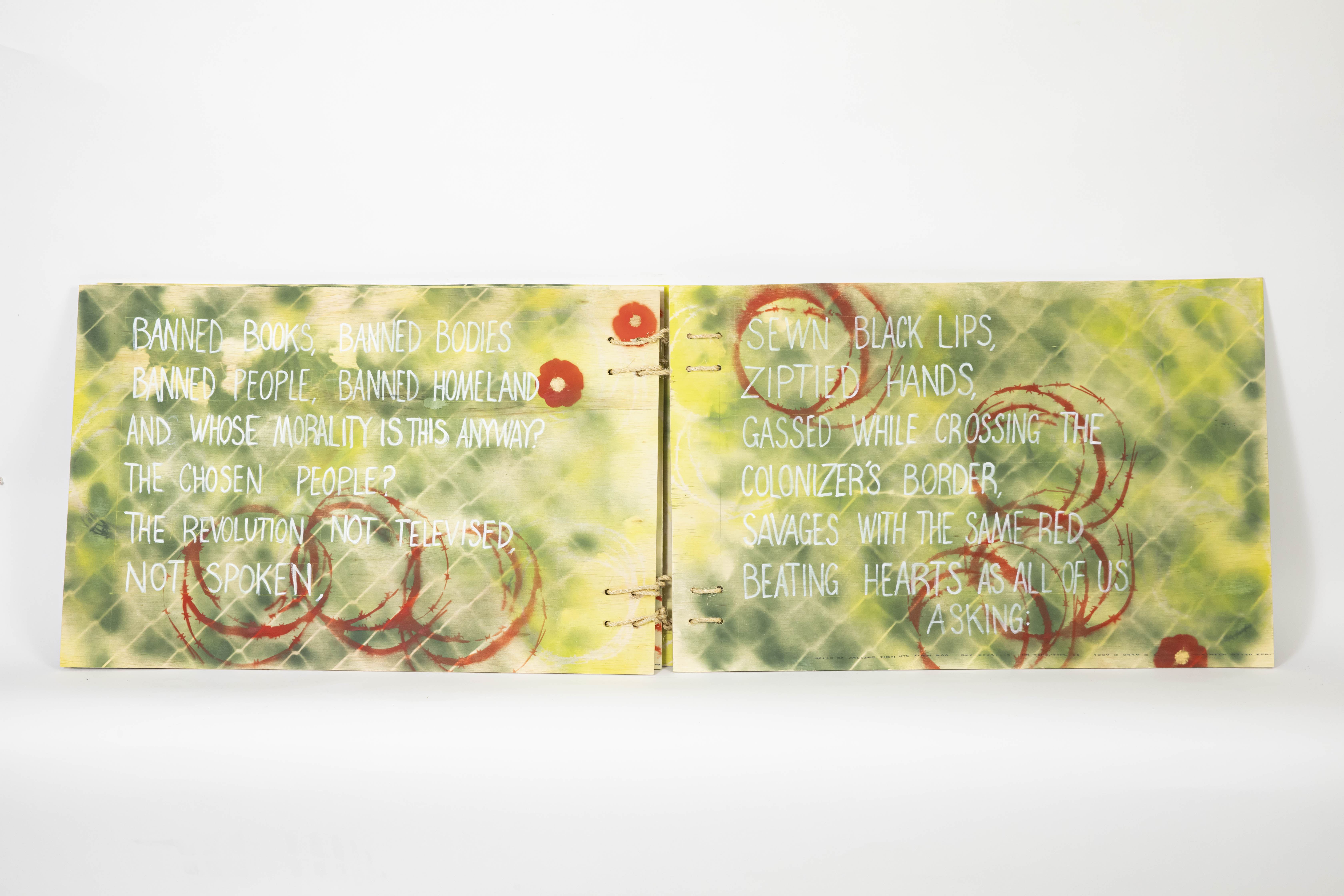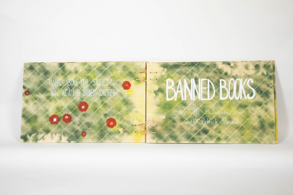 “Patrick Vincent and Ali El-Chaer’s collaborative book visualize’s El-Chaer’s original poem ‘Banned Books.’ The poem and its visualization reacts to historic and contemporary violence, colonialism, and oppression related to the restriction of writing and access to books.” –Unbannable Library project